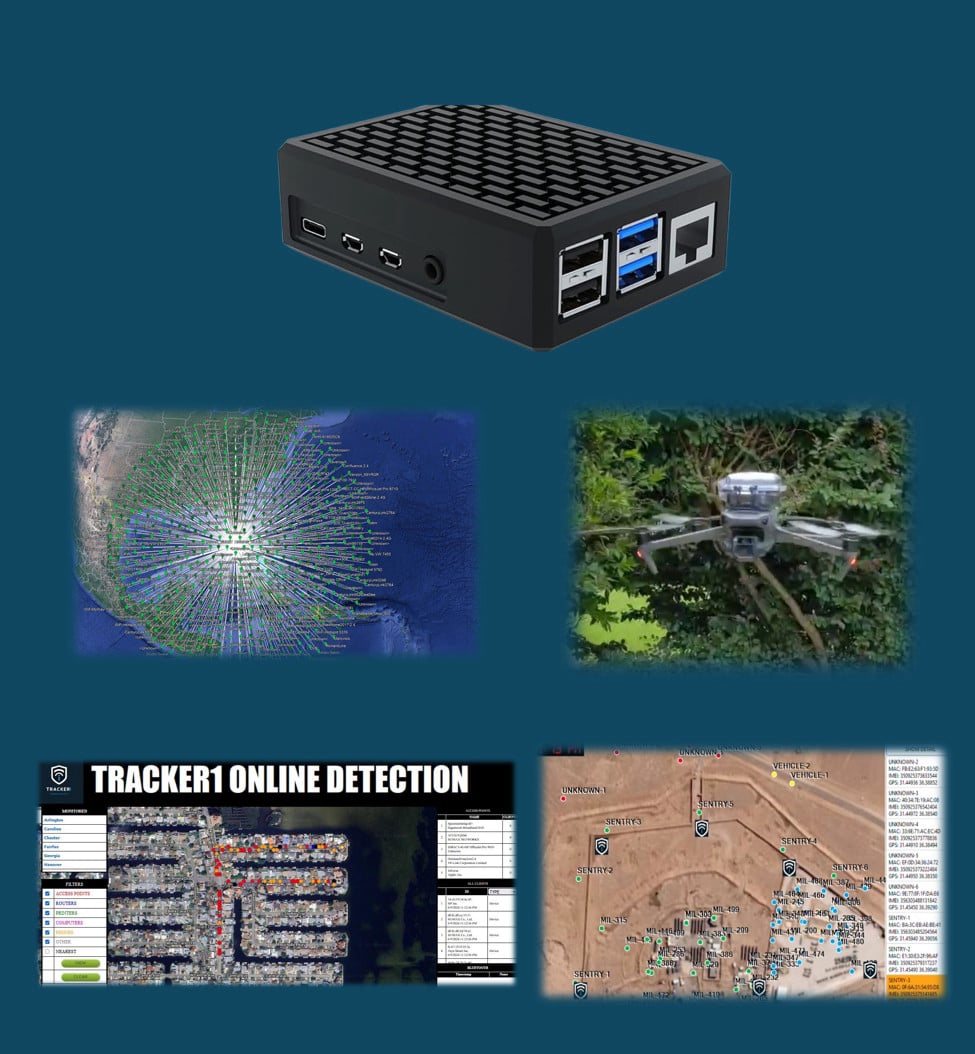 Tracker1 and Seeker1 products are small devices (less than 300 grams) which detect and any communications devices within a large area depending on which Tracker1 device selected. Cellular, Wi-Fi, and other Radio Frequency transmissions are captured every fraction of a second and reported in real time to a central monitoring station for instant action or latereview.